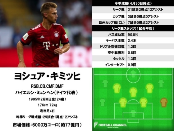 ヨシュア・キミッヒの今季成績(4月30日時点)やリーグ戦平均スタッツなど【写真:Getty Images】