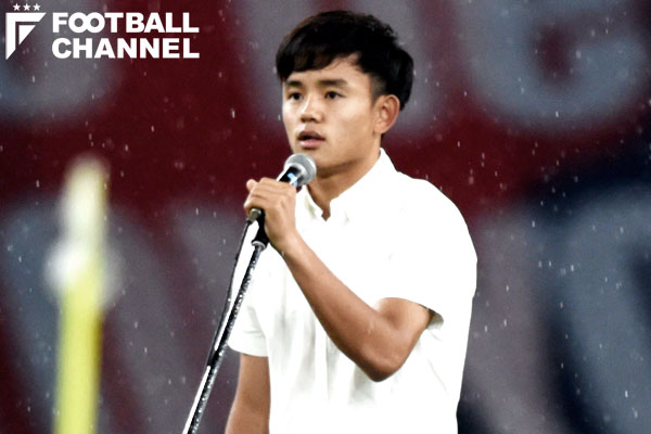 事前に文章の類をいっさい用意せず、脳裏に浮かんださまざまな思いを言葉に変換させていく。当意即妙にして臨機応変、という四字熟語がぴったりと当てはまる久保建英の旅立ちの言葉は、雨が降りしきる味の素スタジアムのピッチの中央で約4分間にわたって紡がれた。