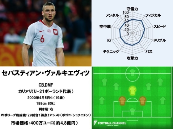 5位:セバスティアン・ヴァルキエヴィツ(カリアリ/U-21ポーランド代表)