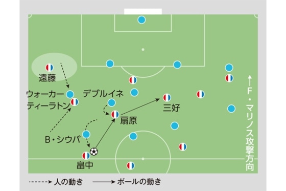 本来であればB・シウバは畠中を、ウォーカーは遠藤を、そしてデ・ブルイネは内側のケアをしながら扇原を見るべき局面であったが、3人全員がティーラトンに意識を向けた。その結果、畠中から扇原へのパスコースが開け、扇原から三好へのパスコースも開け、最後はウォーカーのマークが外れた遠藤が押し込んで奪う、狙い通りの得点であった。