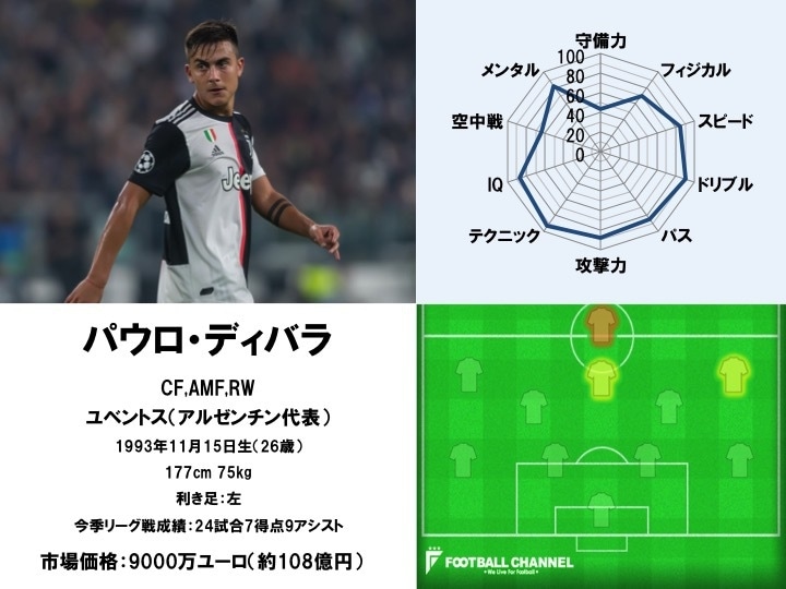 ユベントスでは現在、クリスティアーノ・ロナウドが絶対的選手として君臨している。そのため、ディバラの存在感が薄れてしまうこともあるのは事実。しかし、兼ね備える能力は主役の座を十分に奪える水準にある。マウリツィオ・サッリ監督の下で存在感を取り戻しつつあるが、これを継続させていきたい。