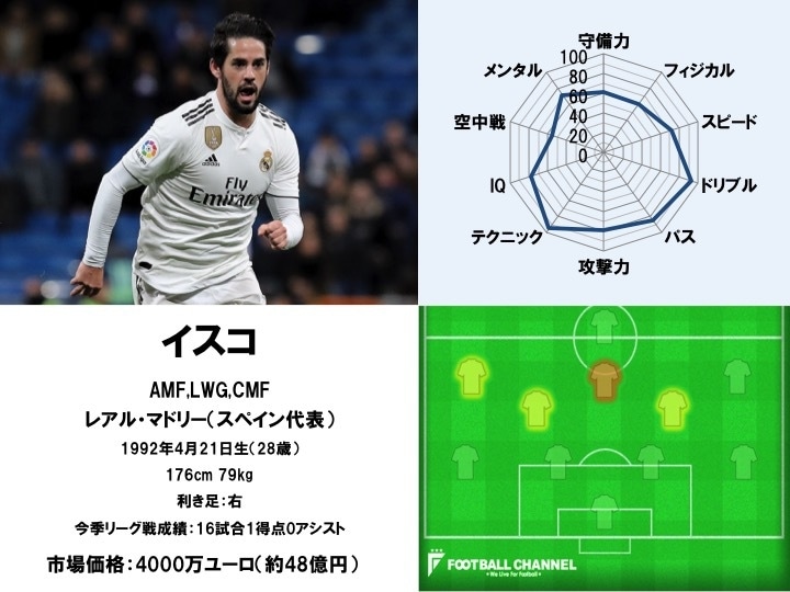 マドリーではインサイドハーフとウィングで起用されるイスコだが、先述した通り本領発揮となっていない。確かな能力の持ち主であるため、このままの状態を継続させるのは勿体ない気もするが…。