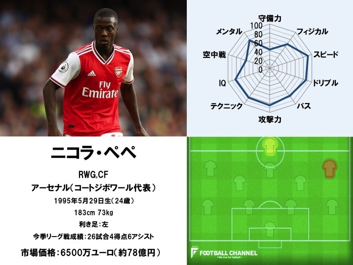 ただ、ペペは現在プレミアリーグという舞台に馴染むのに精一杯。今季リーグ戦ではここまで26試合で4得点6アシストと、期待値には程遠い内容に終始している。批判の的にされることも少なくはない。しかし、先述した通りウイングとしての能力は非常に高いため、今後の活躍に注目したいところだ。