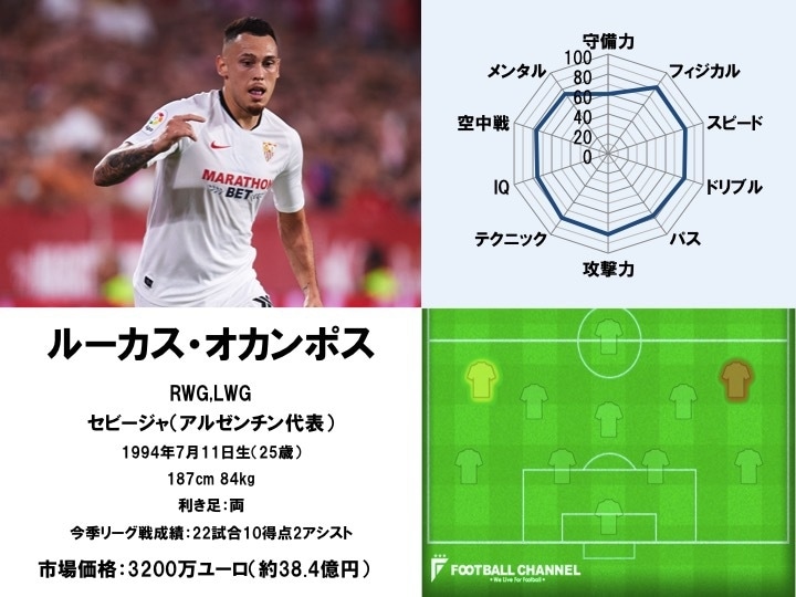 リーベル・プレートでプロデビュー後、モナコやミランなどでプレーした経験を持つアルゼンチン代表FW。今季はマルセイユからの完全移籍でセビージャに加入している。攻撃的なポジションであればどこでも対応可能という柔軟性を持つルーカス・オカンポスだが、フレン・ロペテギ監督の下では主に右ウイングとして奮闘中。新天地1年目ながらここまでリーグ戦22試合の出場で10得点2アシストを記録するなど、スペインの地で印象的なパフォーマンスを見せ続けている。