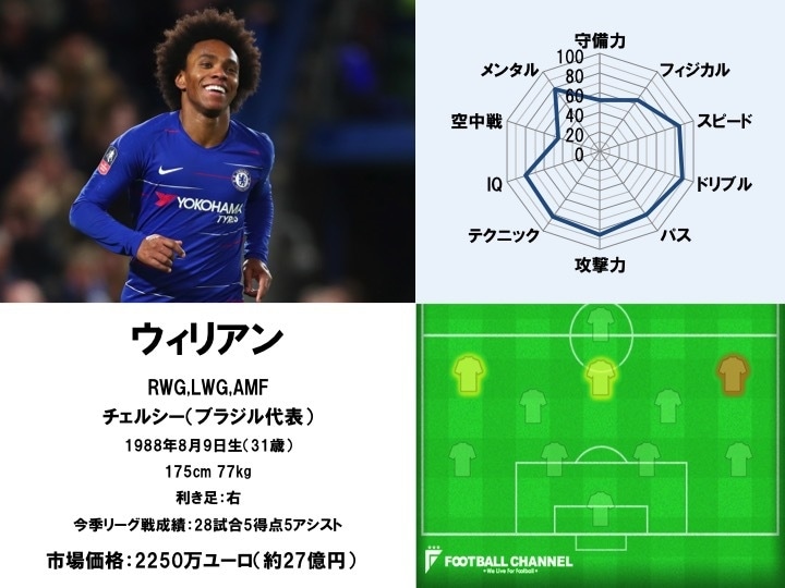 アフロヘアーが特徴的なブラジル代表アタッカー。コリンチャンス、シャフタール・ドネツク、アンジ・マハチカラへの在籍を経て加入したチェルシーでは攻撃の中心的存在として活躍しており、プレミアリーグ制覇やヨーロッパリーグ制覇などに大きく貢献している。エデン・アザールが抜けた今季は、同選手より背番号10を継承。チームにおいて文字通り“必要不可欠”な存在となっており、リーグ戦ではここまで28試合の出場で5得点5アシストの成績を収めている。