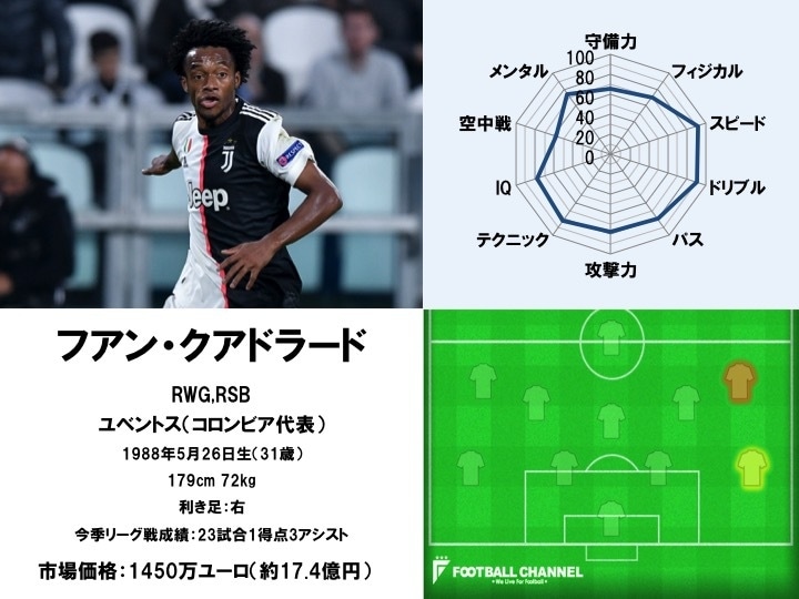 コロンビア代表として2度のワールドカップ出場を誇る南米屈指のアタッカー。2015年より所属するユベントスでも数多くの名手が揃う中コンスタントに出場機会を得ており、同チームのセリエA8連覇、チャンピオンズリーグ(CL)準優勝などに大きく貢献している。そして、ここ最近はサイドバックとしての起用が増加。今年で32歳と年齢的には若くないものの、新境地を開拓し更なる成長を続けている存在だ。