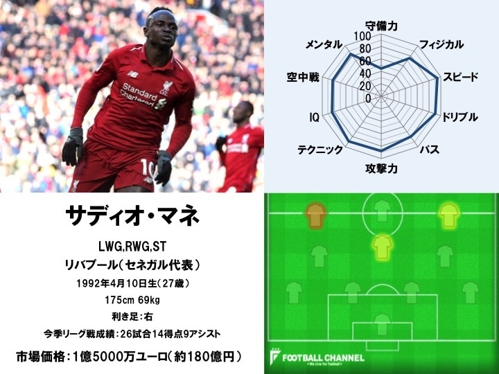ロベルト・フィルミーノ、モハメド・サラーとともにリバプールの攻撃陣を牽引するセネガル代表FW。昨季はチームのチャンピオンズリーグ(CL)優勝に大きく貢献し、リーグ戦では22得点を叩き出し自身初のプレミアリーグ得点王に輝くなど印象的なパフォーマンスを披露した。そして今季はアフリカネーションズカップを決勝まで戦った影響で合流が大幅に遅れたものの、疲労の影響を感じさせないタフネスぶりを発揮してほぼフル稼働中。リーグ戦ではここまで26試合で14得点9アシストを記録中と相変わらずの存在感を放っている。