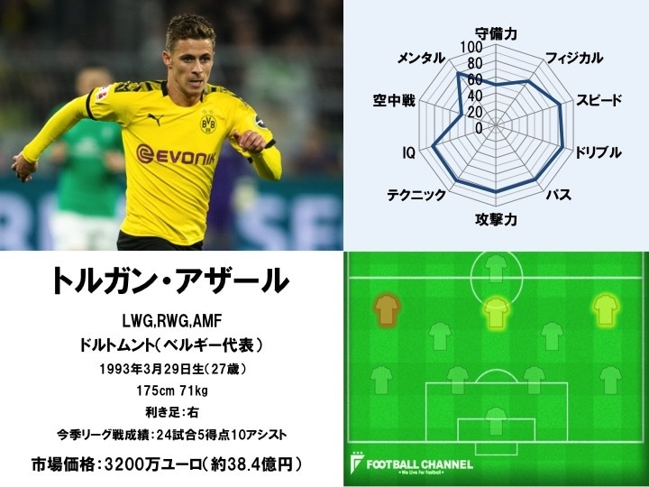 レアル・マドリーに所属するエデン・アザールを兄に持つベルギー代表MF。5年過ごしたボルシア・メンヒェングラートバッハではエースとしての立場を築き、昨季はリーグ戦33試合で10得点12アシストの成績を収めるなど圧巻の活躍を見せた。そんな同選手は今季よりボルシア・ドルトムントに加入。実力者が多く揃う同クラブでは絶対的な主力というわけではないが、ここまでリーグ戦で5得点10アシストを記録中と大きく奮闘している。