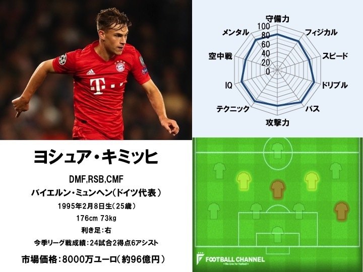 そして豊富なスタミナ、危機察知能力の高さ、ポジショニングの良さ、ボール奪取の上手さを兼ね備えるなど「IQ」や「守備力」も非常に高い選手。身長は176cmと特別大柄なタイプではないが、球際では簡単に負けない「フィジカル」の強さもあり、「空中戦」でも脆さを見せないのがキミッヒの魅力的なポイントだ。様々なポジションをこなすユーティリティー性も含め、25歳にして類稀なる才能を持っている存在と言えるだろう。