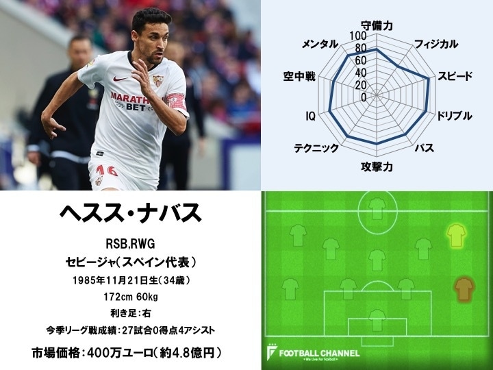 下部組織時代も過ごしたセビージャでは主将も務めるなど、ピッチ内外で頼りとなっているヘスス・ナバス。そんな同選手の武器は数値「88」を記録した「スピード」だ。34歳となっても自慢の脚力はまったく落ちておらず、縦に飛び出す迫力は現在も満点。運動量も非常に豊富なため、90分間継続してサイドを疾走することを可能としている。このあたりは若手選手にもまったく劣っていないと言えるだろう。