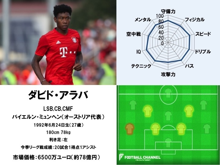 そして「IQ」の高さも見逃せないポイント。アラバはサイドバック、センターバック、ボランチと幅広いポジションでプレーすることを可能としているが、どの場所においても高いレベルでタスクをこなすことができる。柔軟性と戦術理解度の高さを持ち合わせていると言えるだろう。また、好不調の波が比較的少ない選手でもあるなど、「メンタル」の強さも魅力的なストロングポイントである。