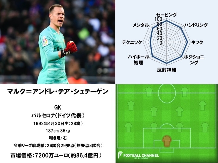 今季にはクラブ通算200試合出場を達成したマルク=アンドレ・テア・シュテーゲンは、驚異的な「セービング」で幾度となくチームを救ってきた。「反射神経」の良さはピカイチで、その長い手足を活かして難しいコースへのシュートも確実にストップ。とくに相手のいない場所、あるいはピッチの外へボールを弾き出す能力が非常に高く、敵に二次攻撃のチャンスを与えないのが魅力的。ハンドリングエラーが少ないのも評価できるポイントだ。