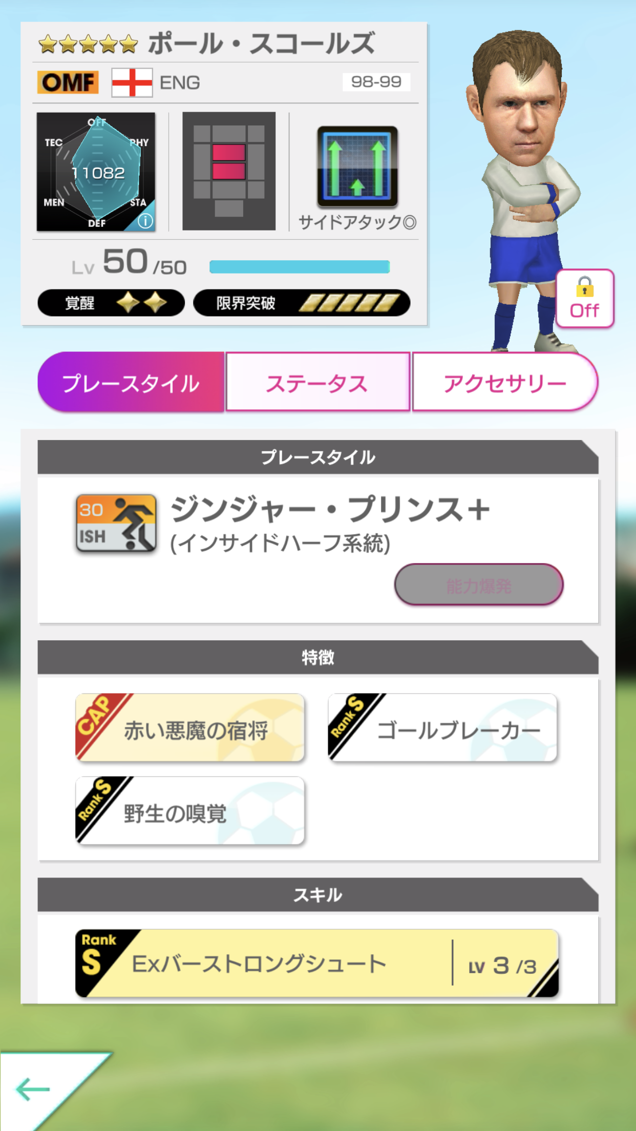 最高評価となったのは、やはり「テクニック」の93。中盤での卓越したボールコントロールで試合を支配し、抜群の精度を誇る「パス」でチャンスを生み出す姿は当時のユナイテッドの最大の見どころであり、対戦した世界中の名手たちが驚嘆の声をあげていた。