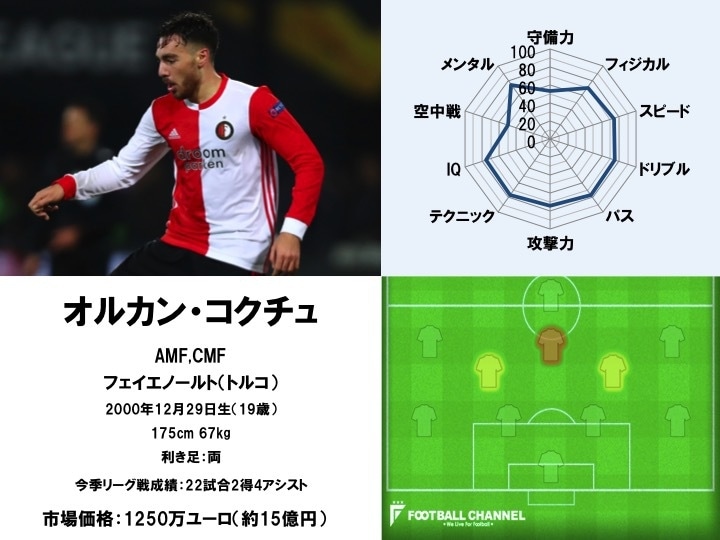 オルカン・コクチュは中盤でのプレーを基本としている選手。ストロングポイントはパスセンスであり、実際フェイエノールトでは幅広いエリアに顔を出してビルドアップをサポートする役割を担っている。さらに、オフ・ザ・ボールの質も抜群に高く、自らが脇役となることで味方にスペースを供給。ボールを持った状態でもそうでない状態でも、チャンスを作り出せるのが最大の強みと言える。