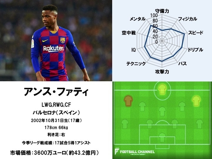 17歳にして推定市場価格が3600万ユーロ(約43.2億円)にまで上っているアンス・ファティは、主にウイングで起用されている。サイドを一瞬で突破する「スピード」があり、17歳とは思えない堂々としたプレーが目立つ。中でも「ドリブル」のキレ味は驚異的で、細かいタッチを繰り返しながら相手が飛び込んできたところでズバッとかわす。狭いコースでも確実にボールをコントロールするなど、足元の技術の高さはすでに特筆すべきものがあると言えるだろう。
