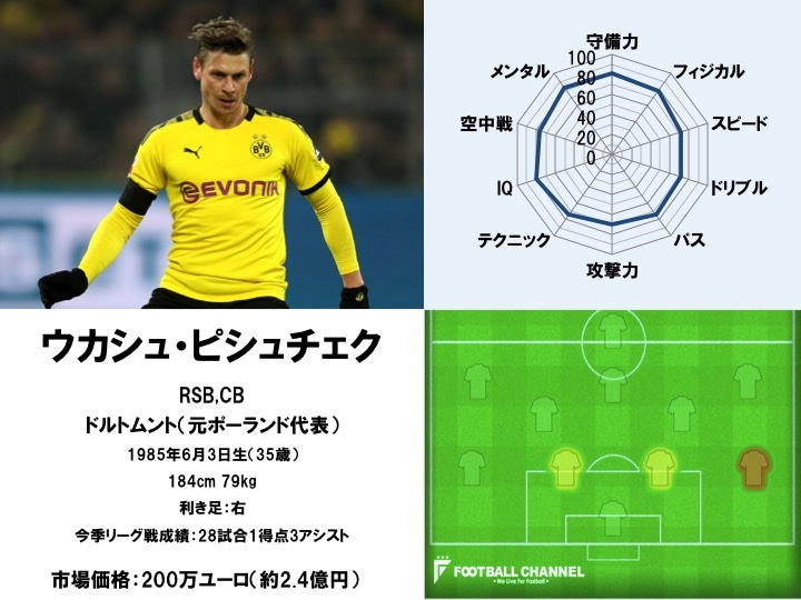 今年で35歳となった元ポーランド代表DF。ロシアワールドカップ、EURO(欧州選手権)3大会の出場を誇る同国屈指の実力者だ。ボルシア・ドルトムント在籍は今季で10年目。若手の多いチームの中でも主力として活躍しており、豊富な経験値と確かなリーダーシップは同クラブにおいて欠かせない要素に。先月にはドルトムントと2021年まで契約を延長。信頼の大きさは明らかである。
