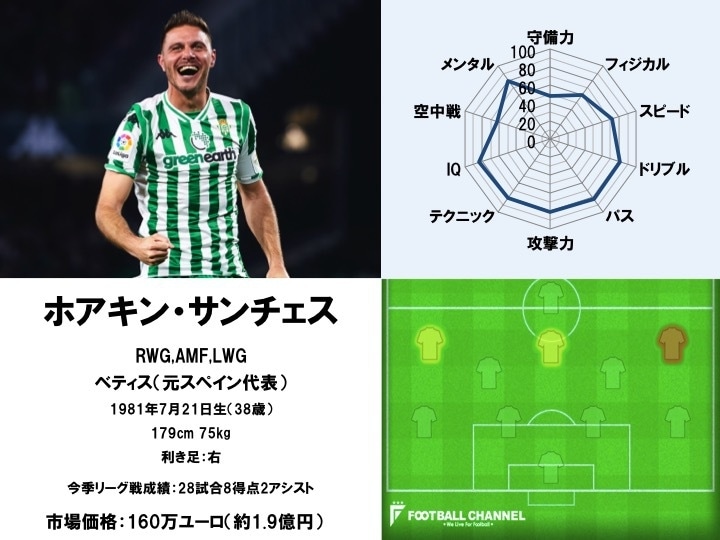そんなホアキン・サンチェスの武器はやはり「ドリブル」と「テクニック」だ。全盛期ほどの「スピード」がないとはいえ、ボールの置き所が的確な「ドリブル」は相手に奪われそうで奪われないほどのキレ味があり、ワンタッチで相手のプレスを剥がすターンなどは非常にエレガント。サイドで起用された際には中にも縦にも突破していくことができるなど、スペイン人らしい技術力の高さは38歳となっても健在だ。