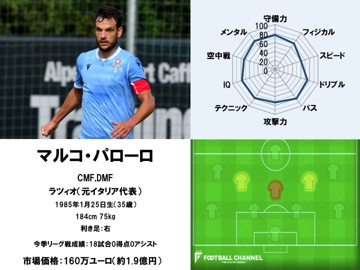 イタリア代表として2014年ブラジルワールドカップ、2016年のEURO(欧州選手権)出場を果たした35歳のMF。2014年より所属しているラツィオでは、コッパ・イタリアやスーペル・コッパ制覇などを経験している選手だ。今季はユベントスとスクデットを争うクラブにおいて絶対的な主力となれているわけではないが、副キャプテンを務めているなど、チームの精神的支柱として頼りにされている。