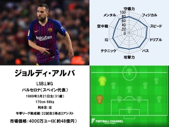 ボールポゼッションを基本とするバルセロナにおいて、ジョルディ・アルバはまさに欠かせないピースだ。スペイン人らしい「テクニック」の高さを持ち合わせており、攻撃をオーガナイズする「パス」の質も十分なレベルに。また、持ち味である「スピード」を活かしながら発揮するオフ・ザ・ボールの動きも秀逸と、味方選手とうまく連係しながら左サイドを活性化させることができる。とくに、リオネル・メッシとの相性はピカイチだ。