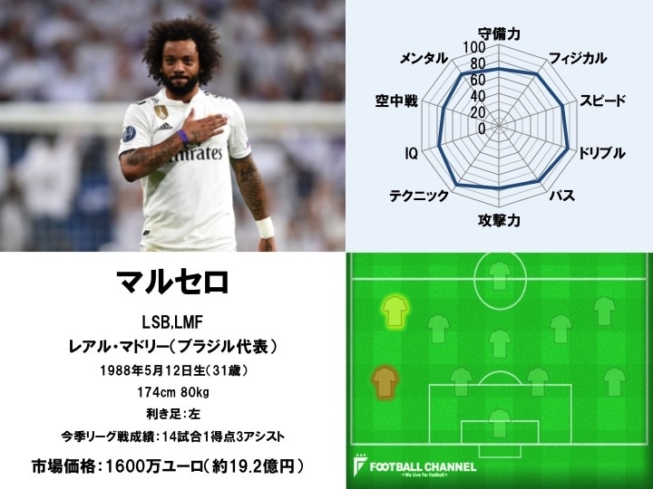 また、身体能力も抜群に高く、浮き球の難しいボールなどを驚異的なバネを活かして簡単に止めてしまう恐ろしさも、マルセロには備わっている。クロスの質も良く、場合によっては自らシュートに持ち運ぶなど、左足が見せる脅威はまさに絶大だ。そのプレースタイルゆえ守備面での批判を浴びることも少なくないマルセロであるが、彼のような存在が唯一無二であることも、紛れもない事実だ。