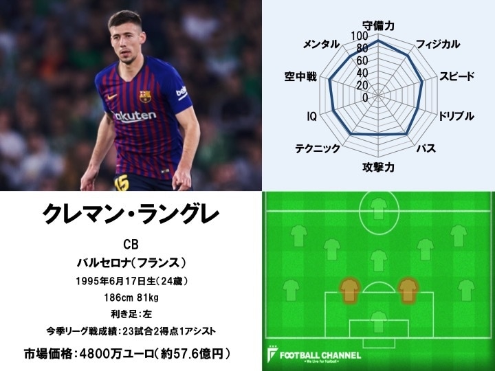 そして、ラングレの忘れてはならない武器はやはり足元の技術力だろう。「パス」を確実に散らす冷静さがあり、ロング、ショート問わず正確なキックで最終ラインから攻撃をオーガナイズすることが可能。ビルドアップ面での貢献度はまさに絶大であり、バルセロナのスタイルには確実に合ったCBだと言える。まだ25歳と若いが、現代型CBとしての完成度は高いと言ってもいいのではないか。