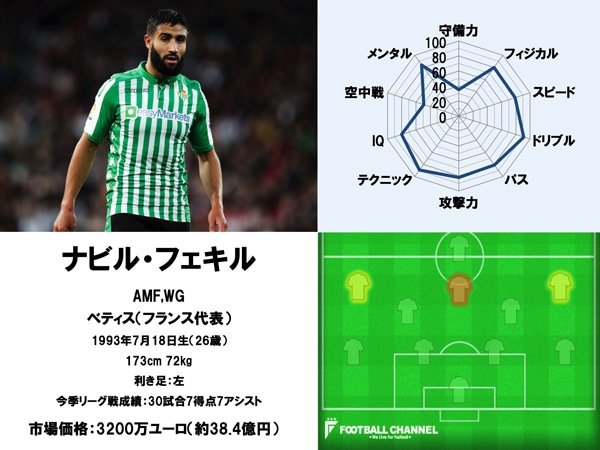11位にはフランス代表のナビル・フェキルが入った。アルジェリア系フランス人で、2013年にリヨンのトップチームに昇格。6シーズンで公式戦193試合に出場して69得点46アシストを記録し、26歳で初の海外移籍に踏み切った。スペインの強豪セビージャからオファーを受けたが、フェキルが選んだのは同地域のライバルであるベティスだった。