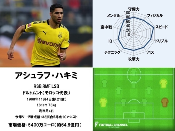 「守備力」に関してはまだまだ向上していく必要がありそうだが、「スピード」と「フィジカル」、確かな攻撃センスを持ち合わせるハキミはサイドプレーヤーとして非常に優秀な存在と言えるだろう。以前までブンデスリーガトップとなる36.4km/hのスピードを記録していたハキミがトップ5入りを逃す理由は見当たらない。