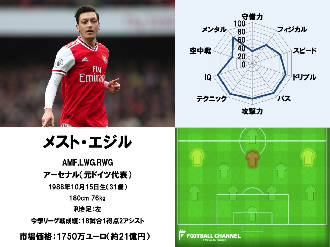 今季はウナイ・エメリ前監督やミケル・アルテタ監督の下で出場機会を得られていない。守備面での貢献度の低さが度々指摘されるが、それを補って余りあるだけのテクニックをエジルは有している。類まれなる精度を誇る左足を持つエジルは30歳を超えてなお、見るものを魅了し続けるだろう。