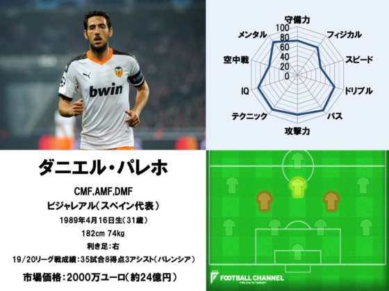 ダニエル・パレホは、まさに“中盤の支配者”である。視野の広さと抜群のキックスキルを兼ね備えており、最終ラインから「パス」を引き出しては自身が組み立ての中心となって攻撃のリズムを生み出す。常に冷静さを保っており、相手の嫌なスペースへ的確かつスピーディーな「パス」を送ることを可能としている。サイドチェンジの質なども極めて高く、「パス」は「90」という飛び抜けた数値を記録することとなった。