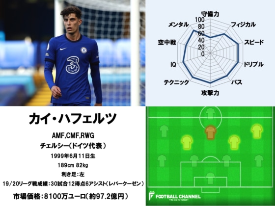 カイ・ハフェルツは、母国の先輩であるメスト・エジルを彷彿とさせるようなエレガントさを兼ね備える選手だ。とにかくタッチが柔らかく、相手の激しいプレッシャーをいとも簡単に剥がすことが可能。視野の広さも抜群で、味方が次のプレーに移りやすいような優しいパスやゴール前での意外性のあるパスで違いを作り出す。決定力も高いなど、前線でありとあらゆる「顔」を見せることができる選手だ。