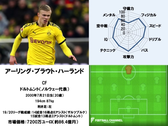 ハーランドは身長194cm・体重87kgという魅力的な体格を誇っている選手であり、その強靭な「フィジカル」を活かしてゴールを量産できる。ボックス内での強さは抜群で、相手に寄せられても簡単にボールを失うことがない。また、ポジショニングの良さに19歳とは思えない落ち着きぶりと「メンタル」の強さも、この男がストライカーとしての存在感を発揮できる理由と言えるだろう。