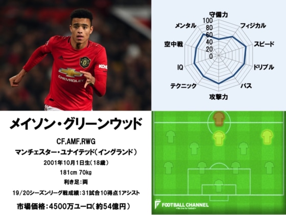 6歳からマンチェスター・ユナイテッドの下部組織でプレーするメイソン・グリーンウッドは、昨年3月に17歳156日という若さでトップチームデビューを果たした。今季は徐々に出場機会を増やしていき、リーグ戦終盤は2列目の右サイドの定位置を確保してゴールを重ねた。