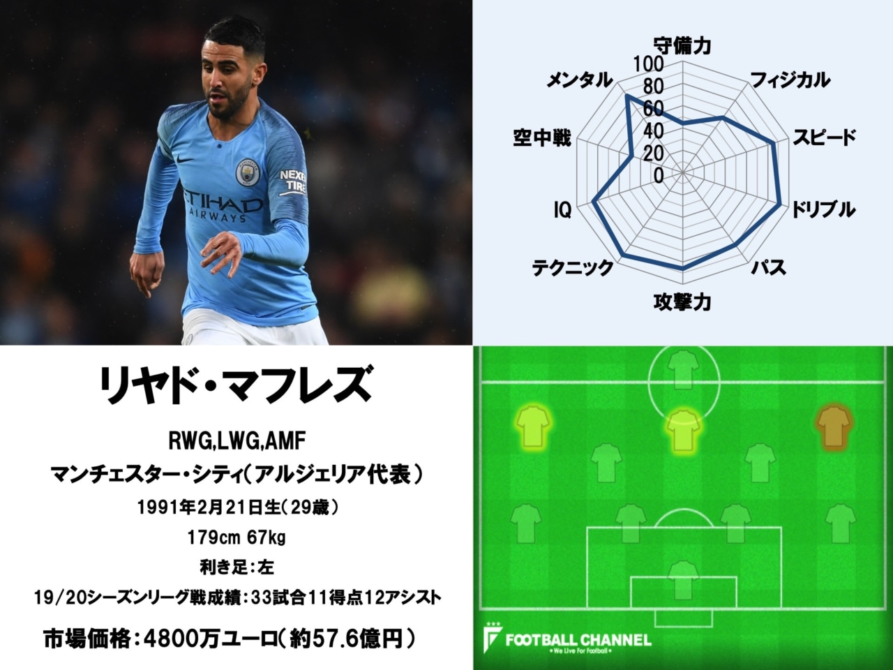 リヤド・マフレズは典型的なドリブラーで、右サイドを主戦場にゴールやアシストを重ねている。ラヒーム・スターリングら実力のあるアタッカーがひしめくマンチェスター・シティでも居場所を築いている。