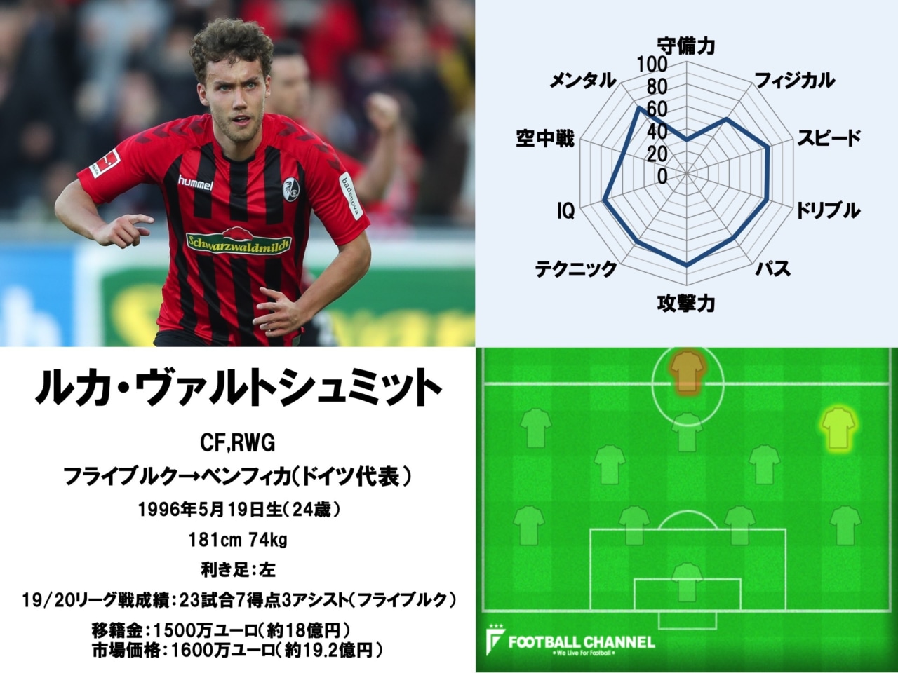 19/20リーグ戦成績:23試合出場/7得点3アシスト(フライブルク)