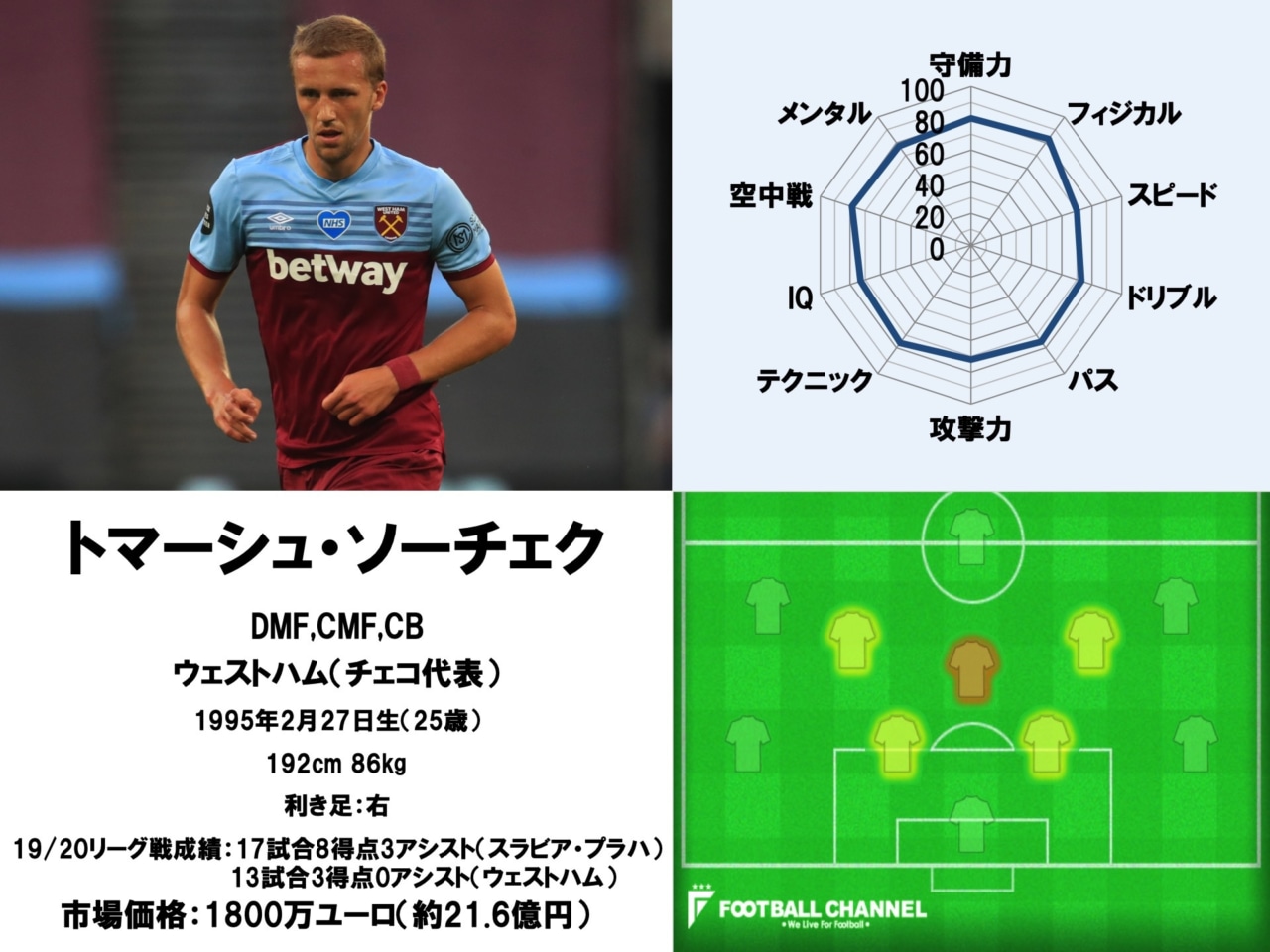 ソーチェクは今年1月にウェストハムに移籍すると、デイビッド・モイーズが直前に就任したチームですぐに定位置を確保した。リーチの長さを活かしたボール奪取が特徴で、センターバックとしてもプレーできる守備力を備えている。192cmの恵まれた体格はセットプレーでも武器になっている。