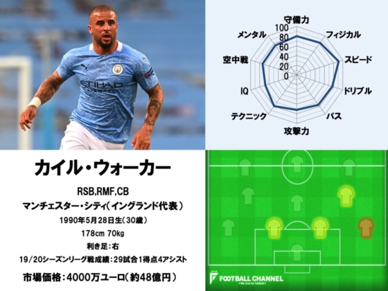 ウォーカーの最大の魅力は「スピード」だ。90分間、右サイドを上下動できるスタミナと、当たり負けしない「フィジカル」を搭載し、1対1では無類の強さを誇る。ペップ・グアルディオラ監督の下ではポジショニングが飛躍的に向上し、ビルドアップや攻撃参加でも高いパフォーマンスを見せている。