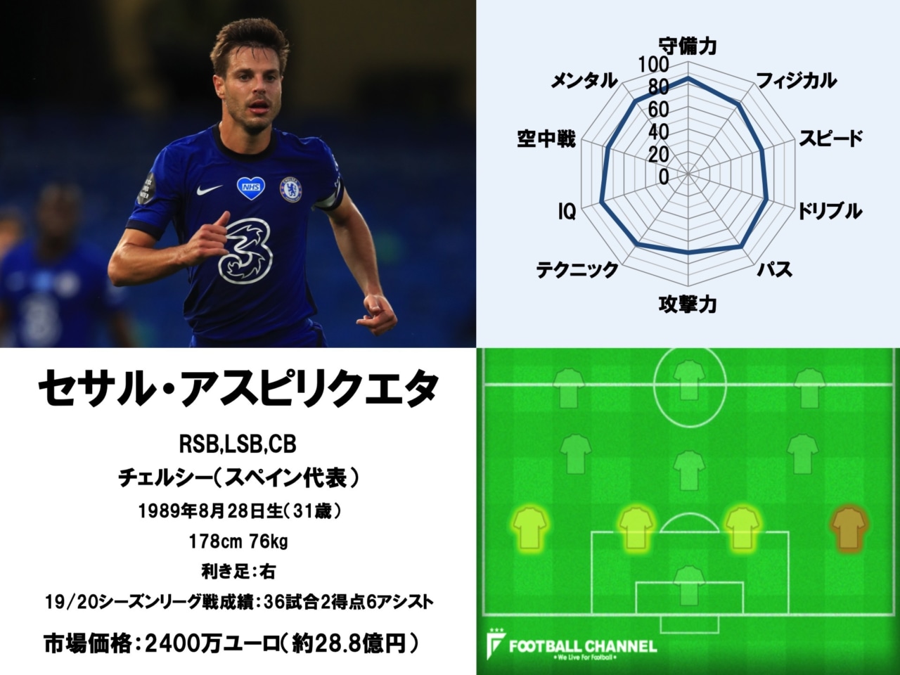 セサル・アスピリクエタはあらゆる面でチェルシーの模範的な存在だ。在籍した7年間ではベンチに置かれる時期もあったが、右サイドバックだけでなく左サイドバックや3バックの一角でもプレーし、現在では主将を務めている。