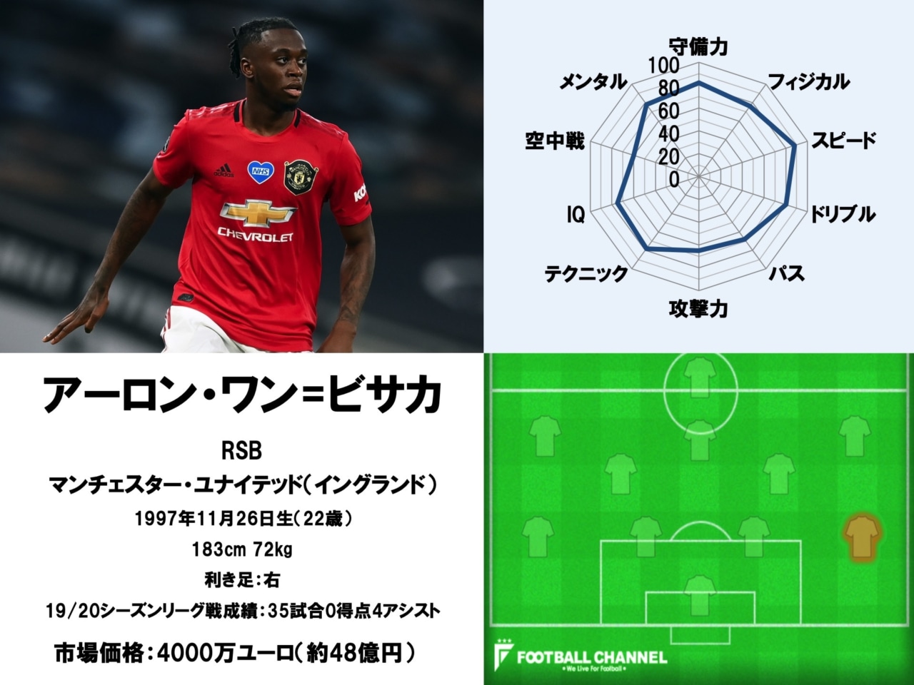 元々は右ウイングだったが、右サイドバックでその才能を開花させた。18年2月にクリスタル・パレスでプレミアリーグデビューを飾ると、翌シーズンは35試合に出場。チームを残留に導く活躍を見せたワン=ビサカに対し、ユナイテッドは5000万ポンド(約68億8000万円)の移籍金をクリスタル・パレスに支払って獲得している。
