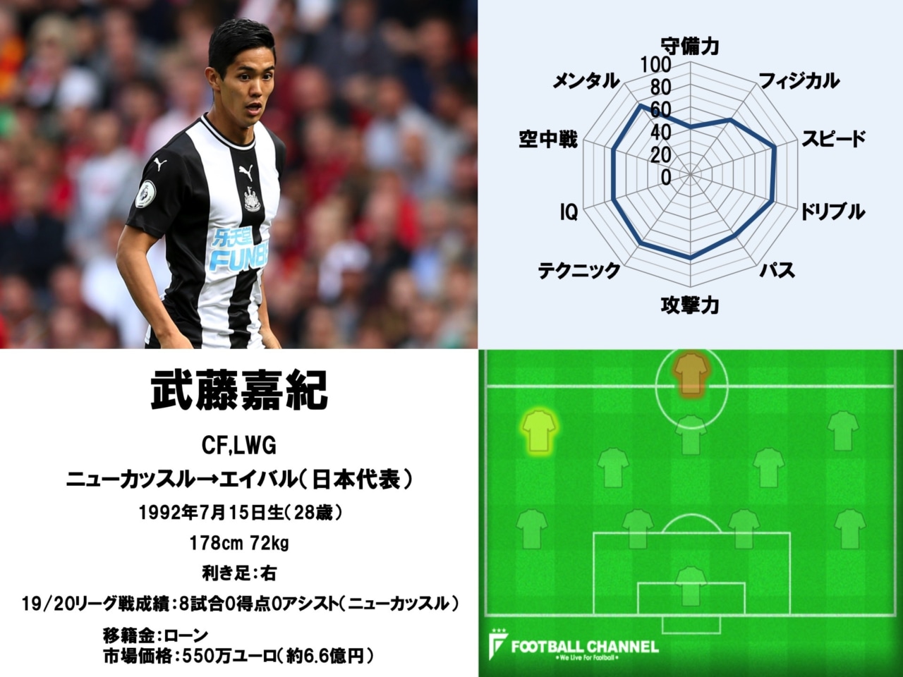 19/20リーグ戦成績:8試合出場/0得点0アシスト(ニューカッスル)