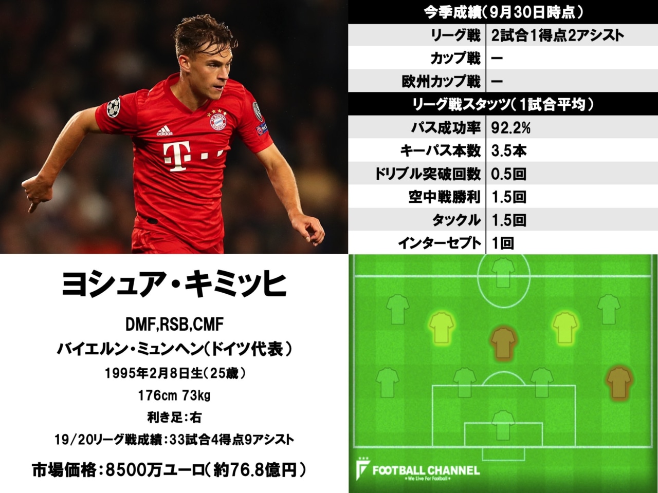 今季初戦となったブンデスリーガ開幕戦で、バイエルンはシャルケを8-0と蹂躙。キミッヒは2アシストの活躍を見せている。ボルシア・ドルトムントとのDFBスーパーカップでは決勝ゴールを決めた。2-2で迎えた83分、中盤でボールを奪ってそのまま持ち上がったキミッヒは、リターンパスをもらい、最後は倒れ込みながら左足でゴールに流し込んでいる。