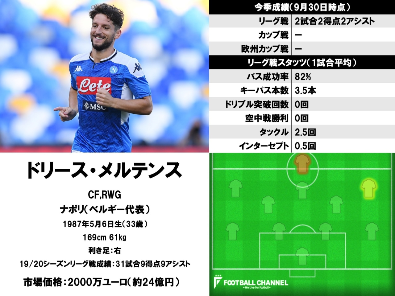 セカンドストライカーとしてプレーするメルテンスはフィニッシャーとしてだけでなく、チャンスメーカーとしての働きを見せている。2試合でシュートにつながったパス本数はチームトップの7本。33歳となったメルテンスは、新たな一面をのぞかせている。