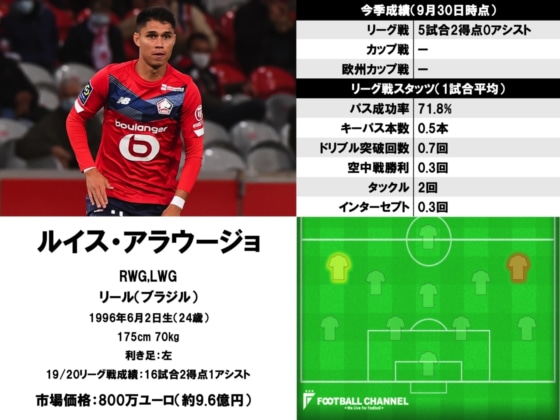 ここ2シーズンは試合途中からの出場がメインになっているルイス・アラウージョ。キャリアハイはリール加入1年目の17/18シーズンにマークした5得点だが、今季は9月だけで2得点を決めている。