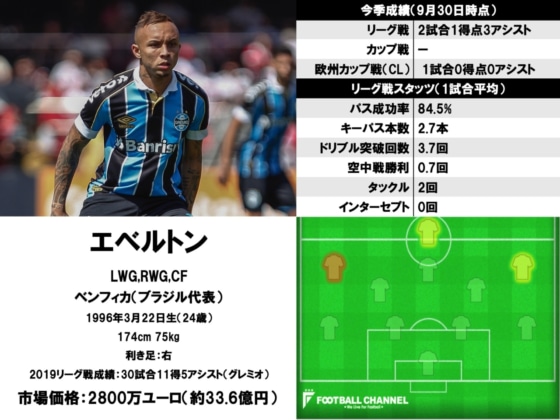 昨夏のコパ・アメリカ(南米選手権)で得点王に輝き、ブラジル代表を優勝に導いたエベルトンは、長くプレーしたグレミオを今夏離れて大西洋を渡った。