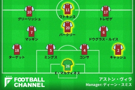 アストン・ヴィラの最新フォーメーション(黄色は今季の新加入選手)