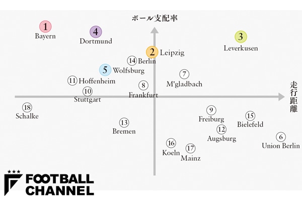では次の座標軸はどうだろう。今度はボール支配率(縦軸)×走行距離(横軸)の座標軸を用意した。ブンデスリーガ(図18)を見てもらえばわかるとおり、王者バイエルンの走行距離は何と下から数えて2番目で、実際のところそこまで走っていない。