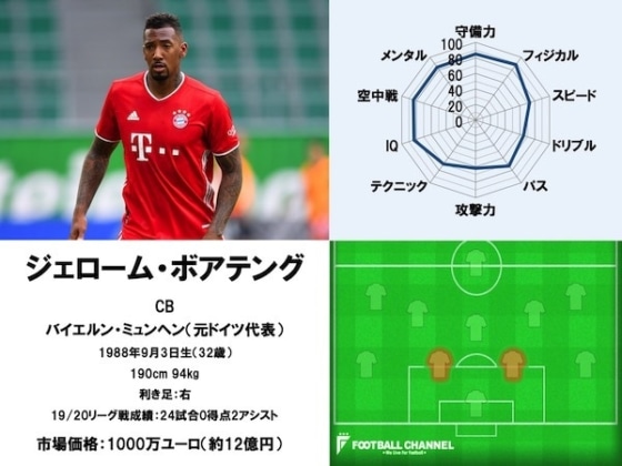 今夏の去就に注目が集まるボアテングは、身長190cm・体重94kgという申し分ない体格を誇る。そこから繰り出されるパワーは圧倒的で、「フィジカル」の数値は最高評価の「88」となっている。また、ガーナ人の父親を持つ同選手は身体能力が抜群に高く、非凡なジャンプ力と長い足を駆使して難しいボールをいとも簡単にクリアしてしまうことを可能としている。