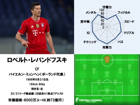 「攻撃力」と「空中戦」に続き高い数値を記録したのは「テクニック」だ。レバンドフスキはボールの置き所が常に的確なため、「パス」を受けてからシュートに至るまでが実にスムーズ。それこそが、得点量産に繋がっている。また、鍛え上げられた肉体から繰り出されるパワーも非凡で、ボールキープでも確かな存在感を示す。まさに、“剛”と“柔”を兼ね備えた化け物である。