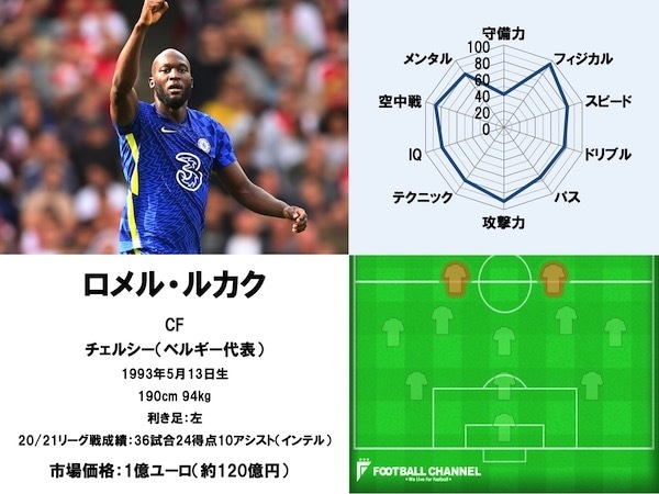 95という高い数字を出した「フィジカル」が最大の武器だが、他の能力も総じて高い。筋骨隆々な身体を持つルカクは「空中戦」やポストプレーに強さを発揮するだけでなく、サイドに流れて「スピード」で勝負することもできる。アントニオ・コンテ監督の下でプレーの幅を広げたルカクは、ワールドクラスのストライカーに成長している。