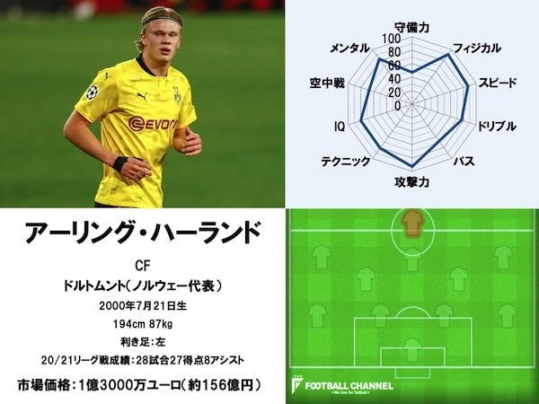 FIFA U-20ワールドカップやCLデビュー戦の大量得点が物語るように、得点能力の高さは図抜けている。ボックス内でクロスに飛び込む動きが非常に巧く、GKとの1対1になれば確実に決めてくれる。柔と剛を巧みに使い分けるハーランドは今後10年のサッカー界を背負う存在となるだろう。