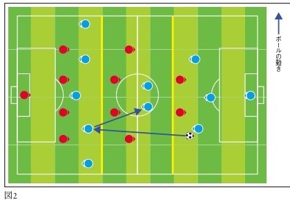 だが[3-2-5]だと、最終ラインから一度中盤を飛ばして前線にセーフティな縦パスが入りやすい(図2)。この縦パスをポストプレーで中盤に落とす形だとどうなるだろうか。ボランチは攻撃方向に対して前を向いてボールを受けられるので、より攻撃的なプレーに繋げやすくなるのだ。いわゆる「レイオフ」と呼ばれるプレーである。